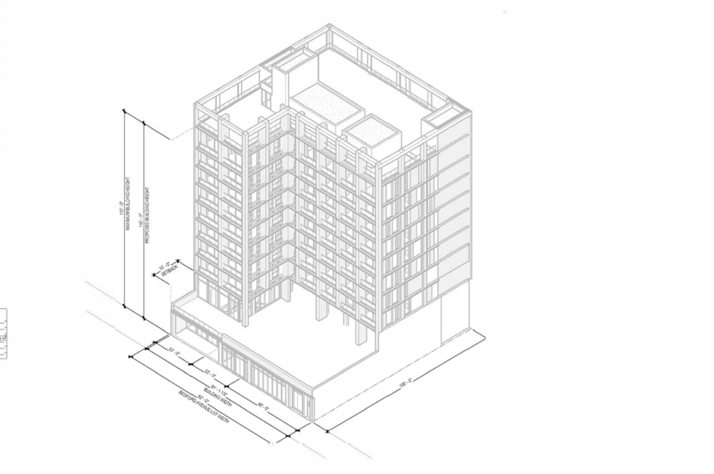 This is the original 2017 project planned for 261 Bedford Avenue. Revised plans for a 210-unit project have not been filed.