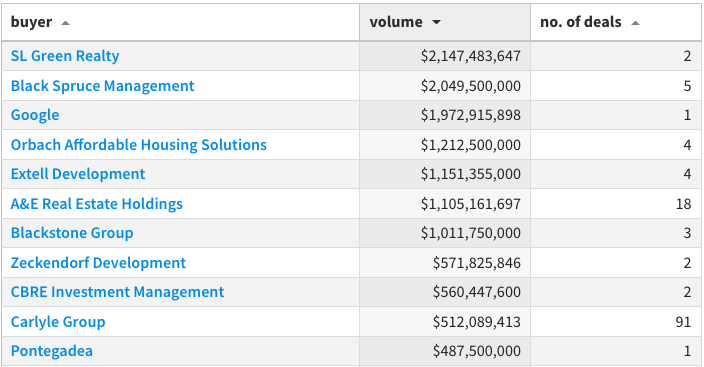 SL Green Realty, Black Spruce Management and Google were the top commercial real estate buyers in New York City in 2022, by dollar amount. Ranking by the number of deals closed, the top three were Carlyle Group, A&E Real Estate Holdings and Chestnut Holdings. The ranking is based on PincusCo Media data. Some of the firms ranked are among the largest real estate companies in New York City, but others are new to the market.