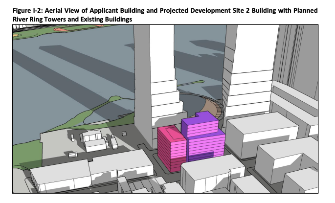 Massing diagram of rezoning, Lot 1 (owned by applicant) is pink, Lot 3 (owned by ConEd) is purple